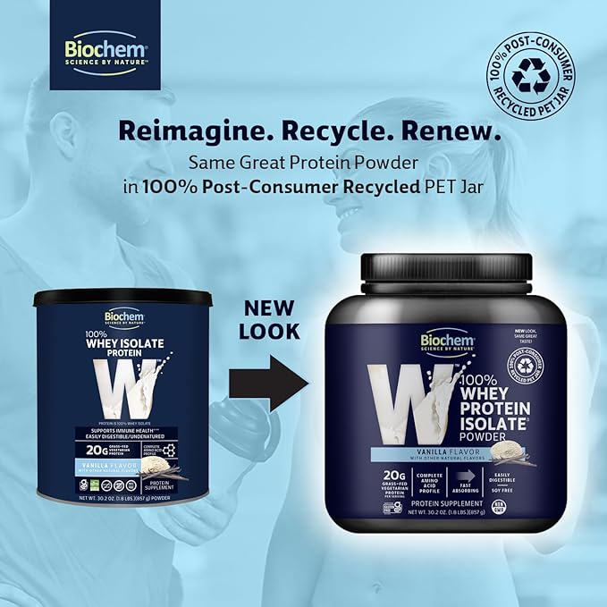 Biochem Whey Protein Isolate Powder - Vanilla Flavor, 20 Grams per Serving, Sourced from Grass Fed Cows, Non-GMO, Vegetarian, No Artificial Flavors or Sweeteners - Supports Muscle Mass & Performance