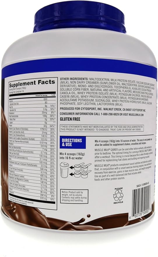 - Key Features Muscle Milk Gainer Powder Contains 32 Grams of Protein, 3 Grams of Leucine From Milk Proteins, and 650 Calories in Every 4 Scoops (162g), the Recommended Usage for Individuals Looking to Build Size and Gain Muscle Mass