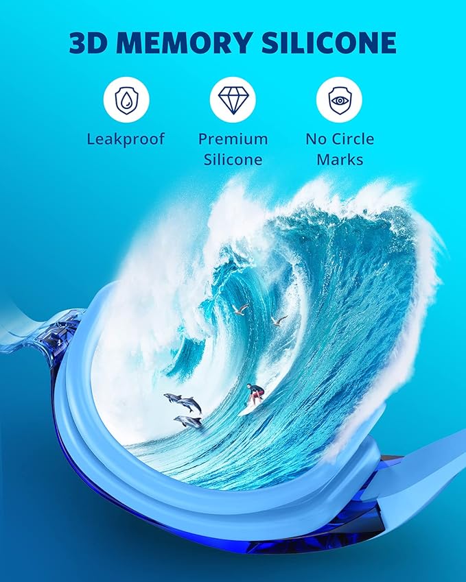 - Great Seal & No Leaking-The ergonomic design of swim goggles with high-quality silicone material ensures a close fit to different face shapes and never allows leakage. In addition, the flexible silicone frame and improved higher nose rest provide extreme comfort and will never hurt your nose or leave marks on your face.