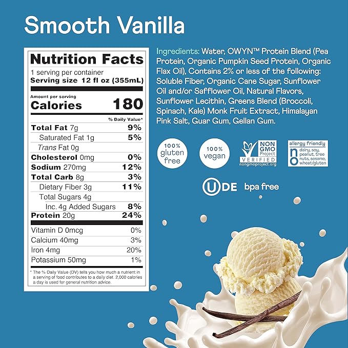 OWYN Only What You Need Plant Based Protein Shake, 20g Vegan Protein from Organic Pumpkin seed, Flax, Pea Blend, Prebiotic supplement, Superfood Greens, all-in-one nutrition, Gluten & Soy-Free (Vanilla, 12 Pack)