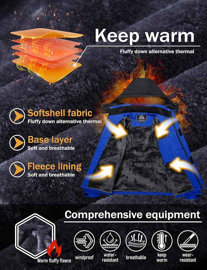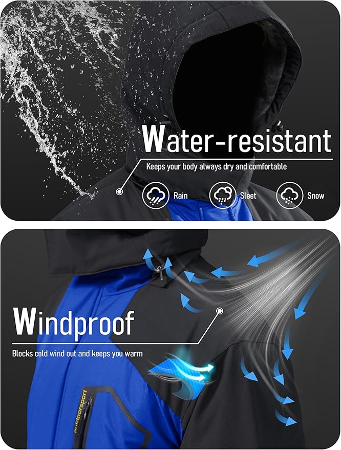 • Water repellent: Professional water repellent jacket, keep your body always dry and comfortable, you won't worry about getting wet while skiing, snowboarding, hunting, hiking in inclement weather.