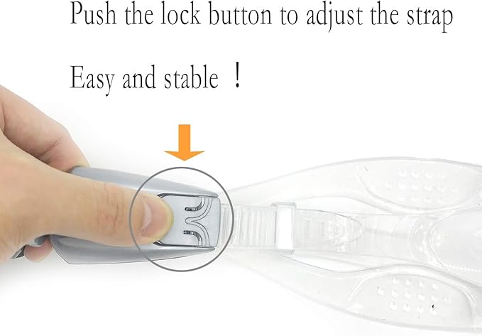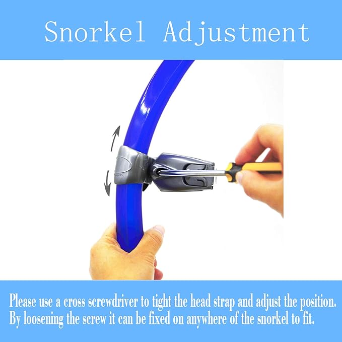 - ·Convenient Adjust Snorkel Head Strap-- The buckle can hold the straps securely in place. Press the strap buckle then pull the soft silicone straps to change the length, The head strap can be adjusted to fit with any swim caps and swimming goggles.