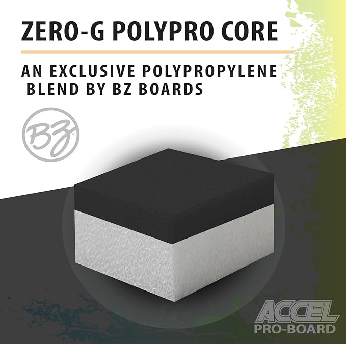 - ZERO-G POLYPRO CORE: A specialized blend of polypropylene (PP) materials developed by BZ. Engineered for exceptional buoyancy, durability, and water resistance. The core's stiffness enhances the rider's ability to maintain speed on the waves.