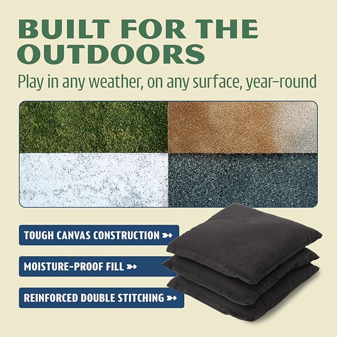 - Weather-Resistant Bean Bags: Built to withstand any climate—each corn-hole sized bean bag (6 x 6 inch) is made from durable, heavy canvas, filled with moisture proof plastic pellets, and double-stitched for long-lasting use.