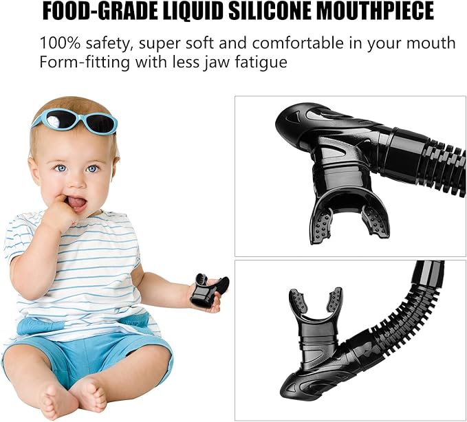 - Advanced Dry Valve and Splash Guard: The innovative dry top valve automatically seals when submerged, effectively blocking water entry. The splash guard further protects against waves, while the advanced design prevents clogging from sand or debris, ensuring consistent and comfortable breathing.