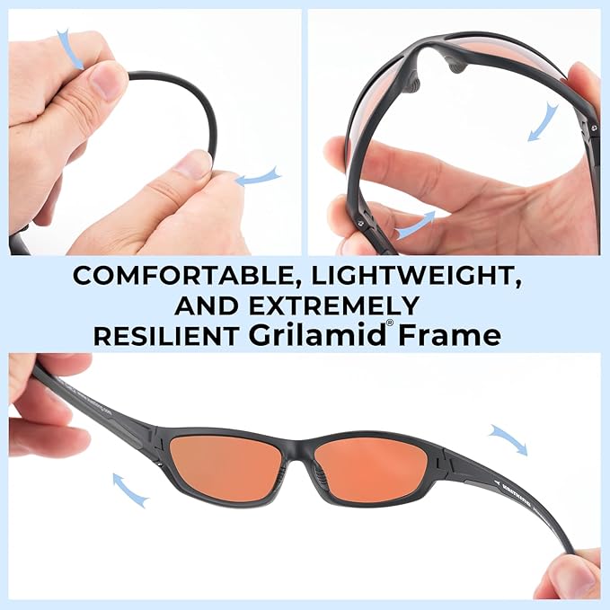 - PREMIUM FRAMES – Made from the same Grilamid material commonly used in military and medical applications, KastKing sunglass frames are lightweight, extremely flexible, and heat and UV resistant. Grilamid frames are well known for their astounding strength, lightweight comfort, shape integrity, and impact resistance. This virtually indestructible ultra-lightweight and malleable material translates to a very comfortable fit and the tacky nose and temple pads prevent slipping.