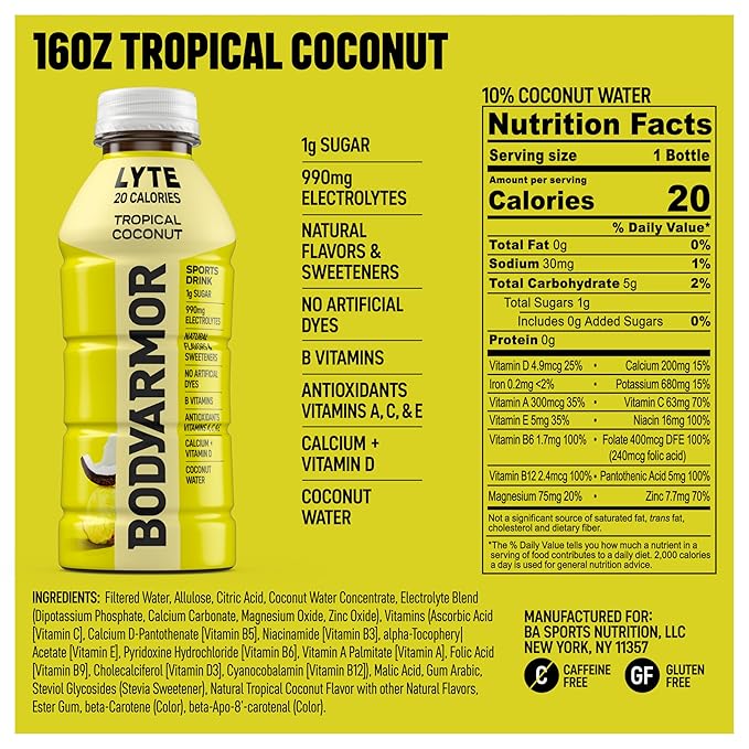- 12 pack, 16 fl oz bottles of BODYARMOR Lyte Tropical Coconut electrolyte drinks for hydration that keeps pace with your active lifestyle