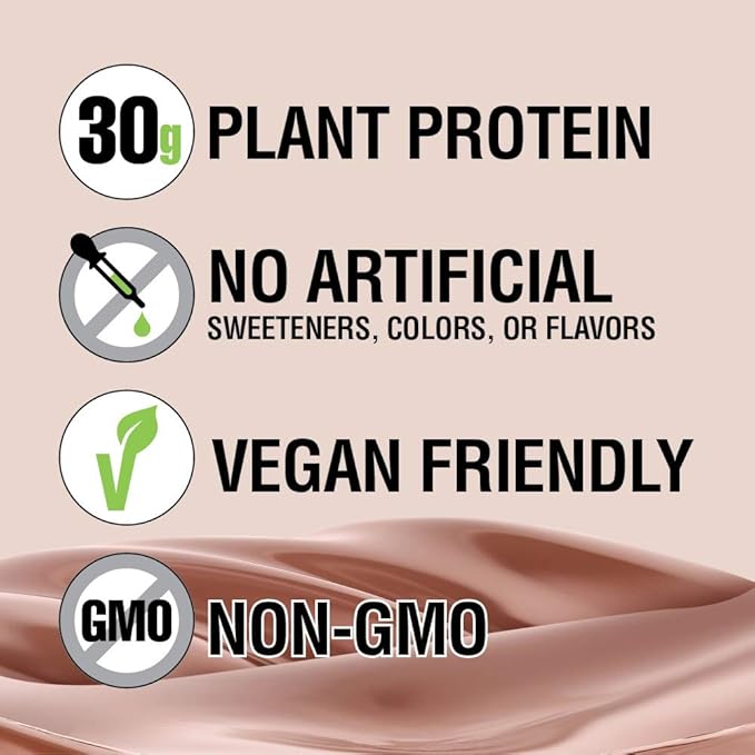 - VEGAN / VEGETARIAN PROTEIN LOVERS REJOICE: Our Plant-Based Chocolate shake contains 30 grams of natural pea and rice protein for the ultimate gourmet protein shake. Amazing flavor with no gritty texture like ordinary plant-based drinks.