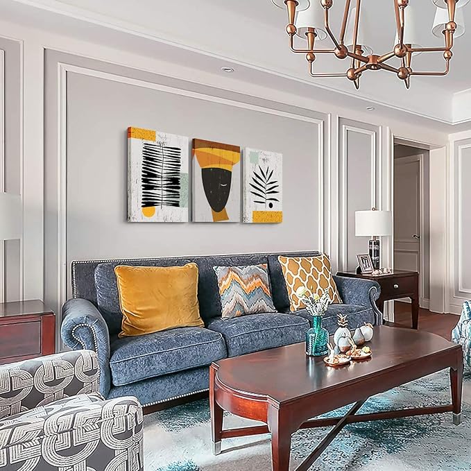 Framed Canvas Wall Art African Ethno Motive Wall Art Set, Abstract Ethno Art, African American Woman Portrait, Black Orange Print, Contemporary Collage, Minimalist (A-3pcs,16x24inchx3pcs)