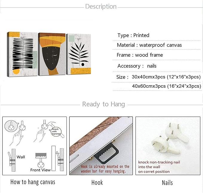 Framed Canvas Wall Art African Ethno Motive Wall Art Set, Abstract Ethno Art, African American Woman Portrait, Black Orange Print, Contemporary Collage, Minimalist (A-3pcs,12x16inchx3pcs)