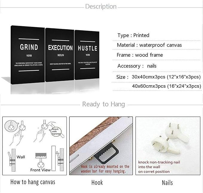 Framed Canvas Wall Art Success Quote, Office Wall Art, Black Large Poster, Positive Motivational Set of 3 Prints, Execute Failure Definition, Inspirational Print (B-3pcs,12x16inchx3pcs)