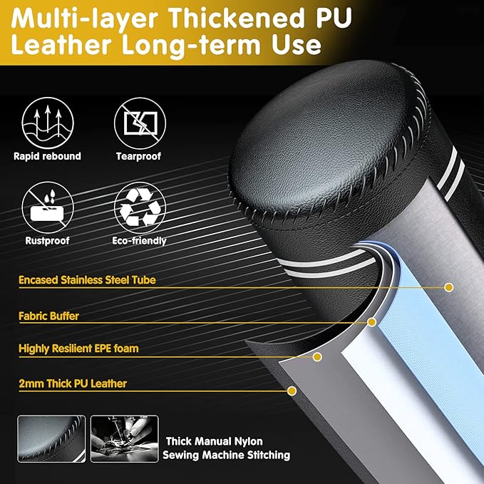 - [PREMIUM MADE MATERIAL] Stainless steel tube stand is encased in multi-layer construction: 2mm thickened PU leather striking surface, high-density EPE foam, eco-friendly fabric buffer. This punching bag with stand is tear-resistant, rapid rebound, withstand long-term onslaught of kicks and punches.