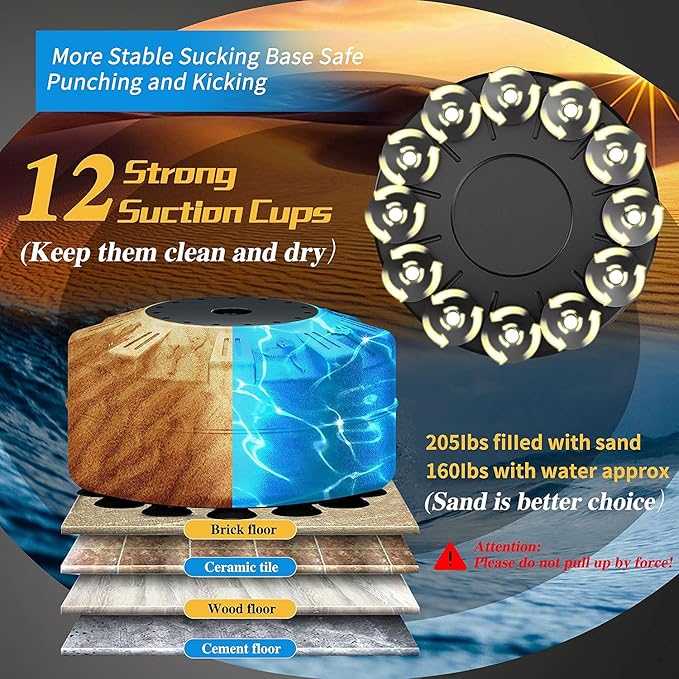- 【Strong Sucking Base】- The kickboxing bag has 5MM thicken ABS round base for easy rolling relocation, which can hold 137lb of water or 182lb of sand, there are also 12 pcs suction cups, to provide stable support for the entire boxing bag. Sand is the better option to make it more stable.