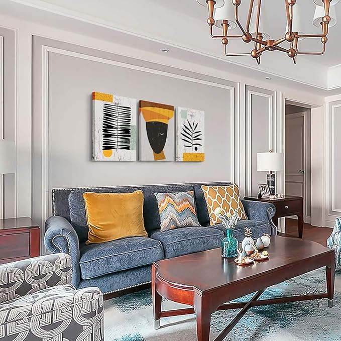 Framed Canvas Wall Art African Ethno Motive Wall Art Set, Abstract Ethno Art, African American Woman Portrait, Black Orange Print, Contemporary Collage, Minimalist (S-3pcs,20x30inchx3pcs)