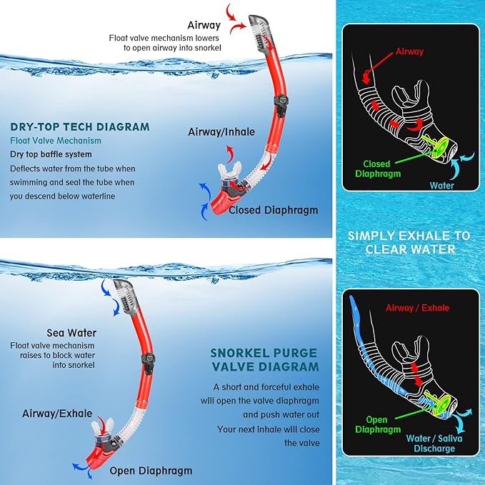 - Unobstructed breathing dry top snorkel: a high-quality snorkel with a dry-top valve that seals the breathing tube when submerged. dry top snorkel is designed to keep water from entering the breathing tube, ergonomic silicone mouthpiece is comfortable and durable. Lower purge valve allows water to be quickly expelled, so you can enjoy easy and unobstructed breathing while diving underwater.