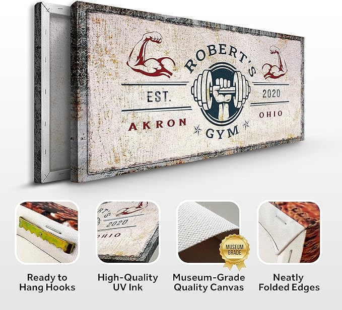 - Museum-Grade Quality - This Gym Sign Wall Art Decor is Prime Gallery-Wrapped Canvas; No sagging, dents, accidental rips; Printed using UV-Resistant Ink with a neatly folded edge