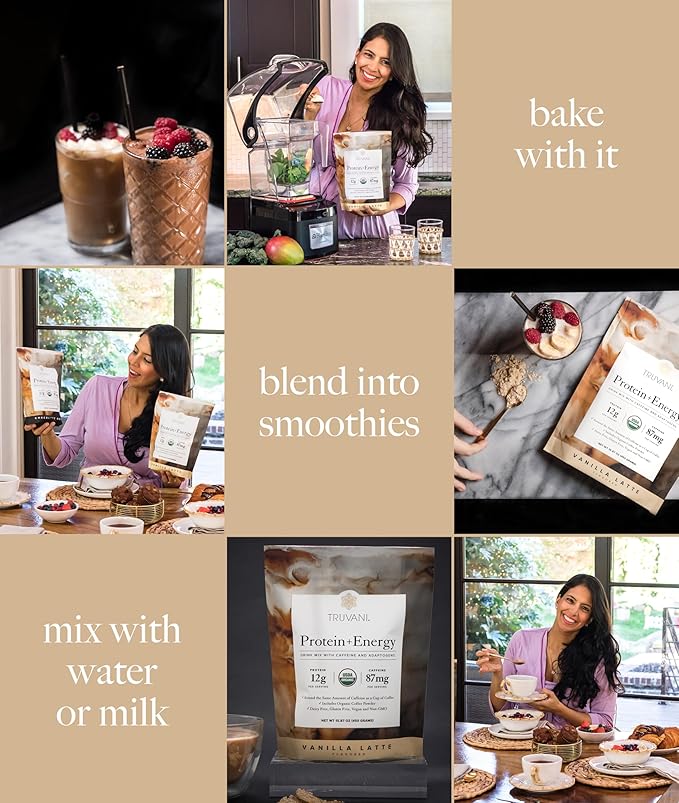 Truvani Protein + Energy Drink Mix with 87mg Caffeine | Vanilla Latte | 12g Organic Plant Based Protein | 20 Servings | USDA Organic Coffee Powder & Adaptogens | Gluten & Dairy Free | Vegan | Non-GMO