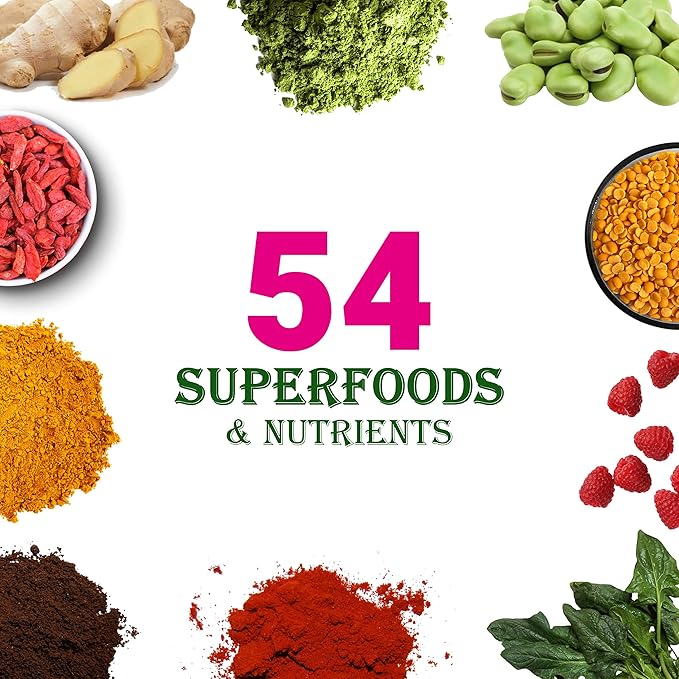 - š±š° š¦šØš£šš„šš¢š¢šš¦ šššš”š: Containing 54 superfoods, like alfalfa, broccoli, brussels sprouts, kale, black currant, spinach, blueberry, goji berry, raspberry, and seabuckthorn, rich in various vitamins, minerals to supports immune system health