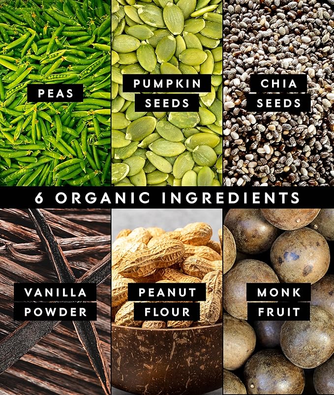 - Certified USDA Organic: Trust in the integrity of our plant-based vegan protein powder, certified USDA Organic, non-GMO, and vegan-friendly. Our straightforward label and simple ingredients ensure transparency and quality. Protein sourced from all organic pea, pumpkin seed, and chia seed.