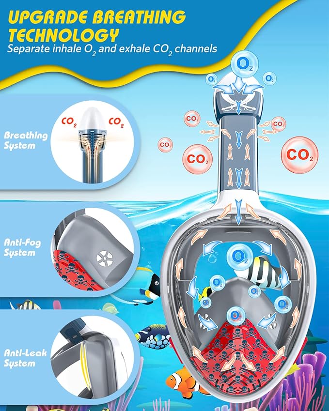 - 【Full Face Snokel Mask For Kids】Be made of hard PC, snorkel mask kids anti fog is non-toxic and odourless; wrapped by soft and thick silicone, it protects your safety and won’t make you headache for longtime wearing; free breath, full face design allows you to breath comfortably through nose and mouth during snorkeling it's safe for kids to use.