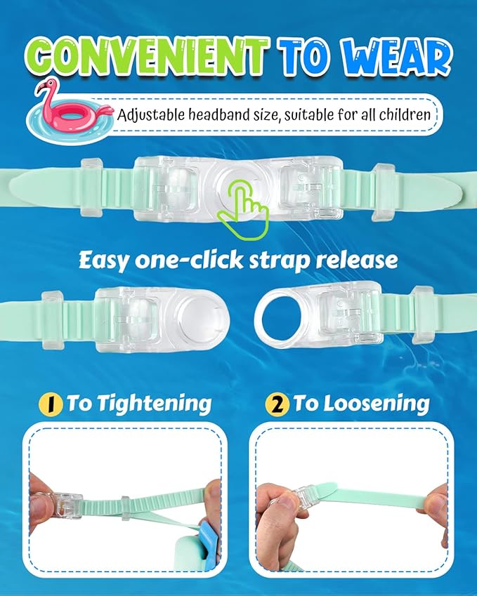 - 【PANORAMIC VIEW & EASY TO WEAR】 Our kids' goggles provide a mask-like fit, carefully designed to accommodate children's faces and ensure a comfortable and secure seal. This not only offers a beautiful and stylish appearance but also expands your child's underwater vision with a panoramic viewWith a convenient button-release design, these goggles are incredibly easy for kids to put on and take off by themselves, promoting independence and a hassle-free swimming experience.
