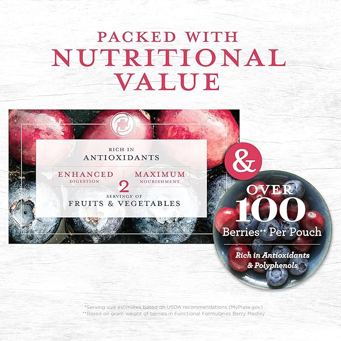 - ADULT FEEDING TUBE FORMULA AND ORAL MEAL REPLACEMENT: Organic, plant-based, whole food peptide adult formula packed with the antioxidant power of berries. There are 2 servings*of fruits vegetable and over 100 berries** in every pouch that are rich in antioxidants & polyphenols