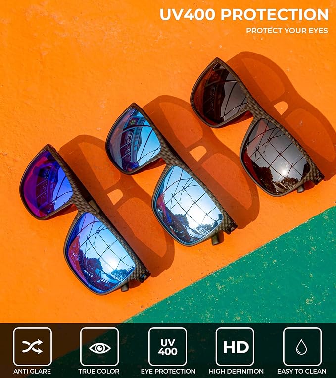 • šŸ˜Ž HD Polarized Lens ā–¶ To prevent your eyes from the harmful UV rays, all of KALIYADI mens sunglasses polarized choose premium polarized lenses with UV400 protection function. You can be free all the time under the sunlight without worrying about the of damage to your eyes from both UVA, UVB and glare. KALIYADI mens polarized sunglasses restore true color of the world and making it more clear and soft.