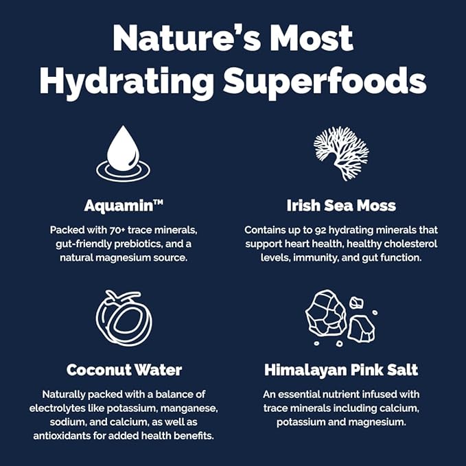 - Special Ingredients : Aquamin™ Magnesium, Irish Sea Moss, Coconut Water, Himalayan Pink Salt