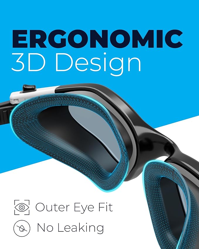• [[ MORE COMFORT ]] - This swim goggles offer soft & flexible silicone double seals designed to expand and contract to hug the unique contours of a swimmer’s face and achieve the right level of suction without applying excessive pressure around the eyes. In addition, the ergonomic 3D frame design ensures low water resistance and the best fit for a wide range of face shapes, men or women, adults or teenagers