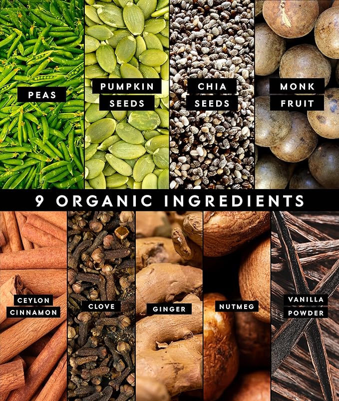 - Certified USDA Organic: Trust in the integrity of our plant-based vegan protein powder, certified USDA Organic, non-GMO, and vegan-friendly. Our straightforward label and simple ingredients ensure transparency and quality. Protein sourced from all organic pea, pumpkin seed, and chia seed.