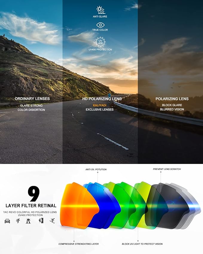 - š Protection and Clarity š¢ KALIYADI sports polarized sunglasses men are designed with the maximum attention to protect your eyes during outdoor activities. The polarized lenses effectively reduce glare, enhancing clarity and providing optimal sight. Whether you're cycling, running, or playing sports, these sunglasses men ensure clear and unobstructed sight, allowing you to fully focus on your performance.