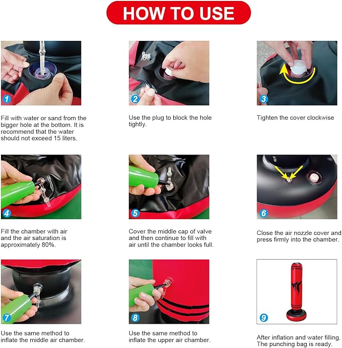 - 1, the new design puts the double water part on the base, which is very convenient to add water or sand,2, the middle connection position is thick, and the rebound speed is faster and more stable when boxing. 3, the inflation port all use double cover air nozzle, the speed of inflation and discharge is very fast.