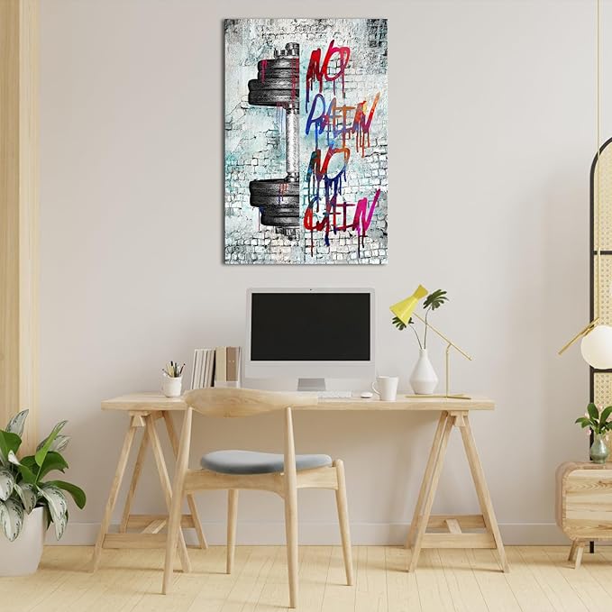 iHAPPYWALL Vintage Inspirational Fitness Quotes Wall Art No Pain No Gain Dumbbells Gym Sport Picture for Home Bodybuilding Room Bedroom Decor Ready to Hang 24x36inch (Grey)