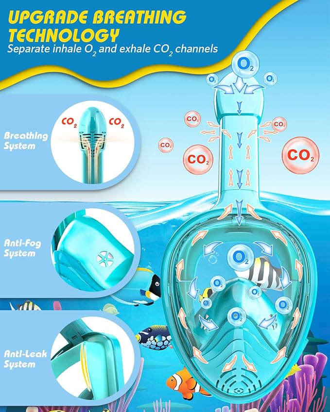 - 【Full Face Snokel Mask For Kids】Be made of hard PC, snorkel mask kids anti fog is non-toxic and odourless; wrapped by soft and thick silicone, it protects your safety and won’t make you headache for longtime wearing; free breath, full face design allows you to breath comfortably through nose and mouth during snorkeling it's safe for kids to use.