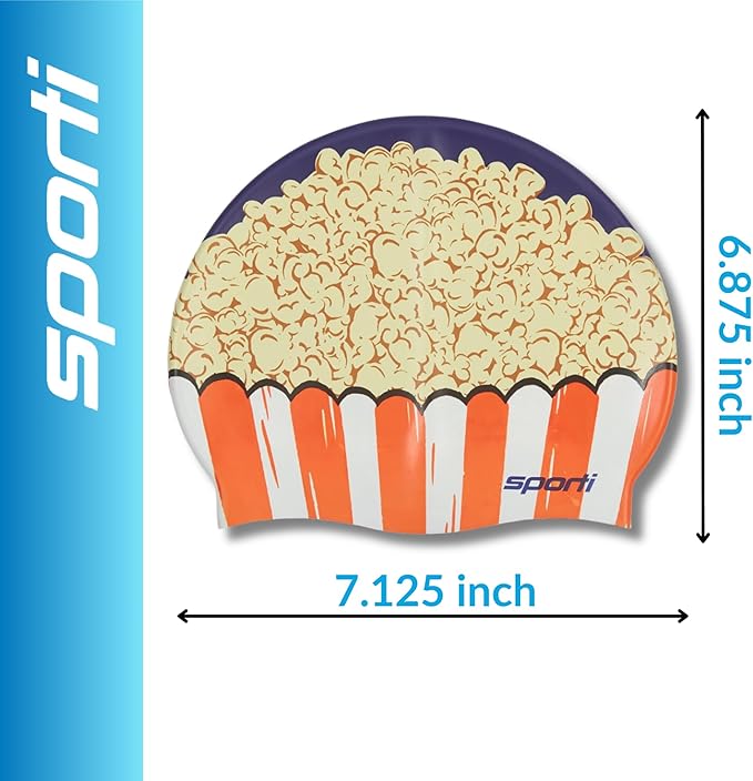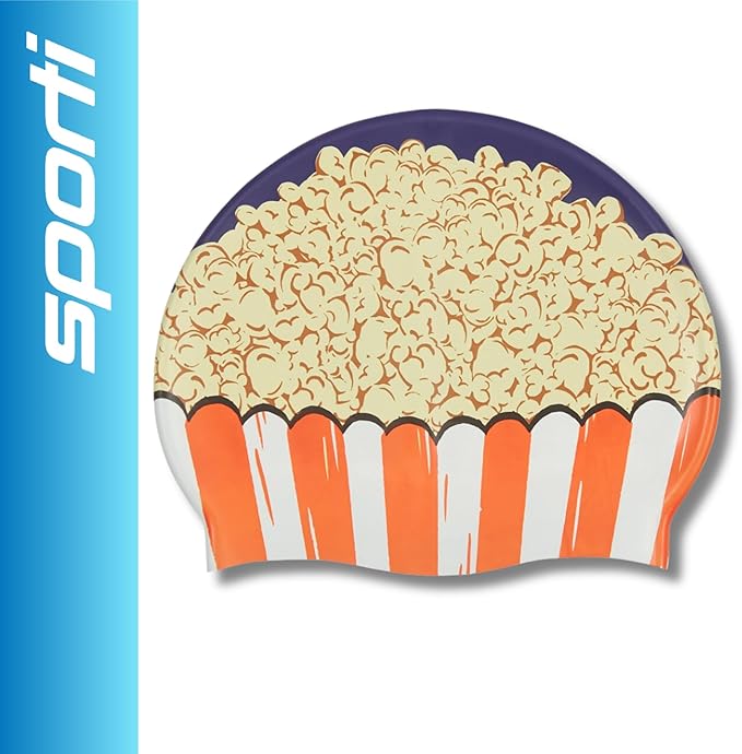 - SILICONE POPCORN PATTERNED SWIM CAP: Bring the fun of the movies to the pool with this kid-friendly swim cap featuring a popcorn-themed print