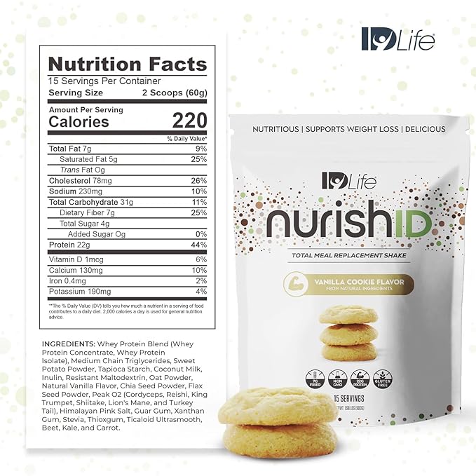 IDLife Vanilla Cookie NurishID Meal Replacement Shake - with Slow-Digesting Carbs, Superfoods, Vegetable Blend and Adaptogenic Mushrooms - 15 Servings