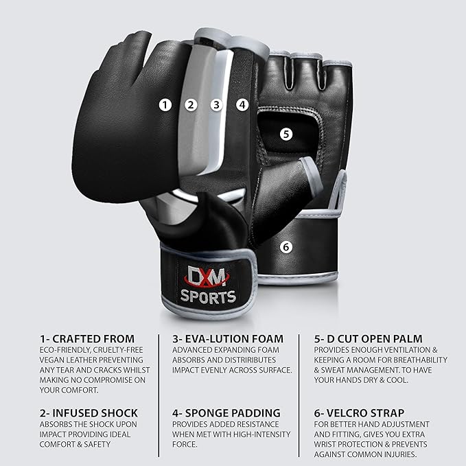- OPEN PALM DESIGN: DXM SPORTS MMA Gloves are engineered with a D-Cut open palm design, providing maximum hand flexibility for grappling maneuvers. Enjoy unhindered control during submissions and clinches, enhancing your overall performance.