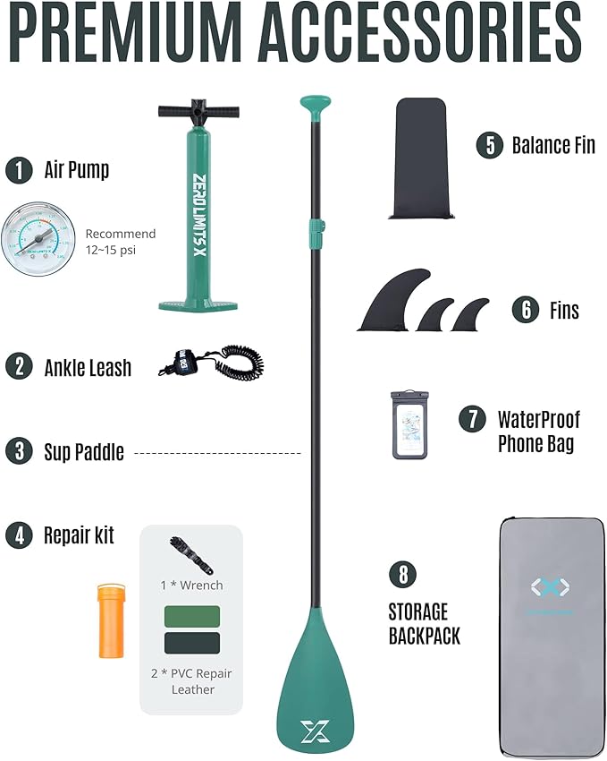 - 【All-in-one Versatility Adventure】Paddle board accessories kit includes paddles, waterproof phone pouch, safety leash, and repair patches, just grab and explore! With 14 stainless steel D-rings and 2 quick-release handles, ZLX inflatable SUP can be mounted with a paddle board seat for fishing, coolers, or rods securely. The front camera mount can record every happy moment for your paddling!