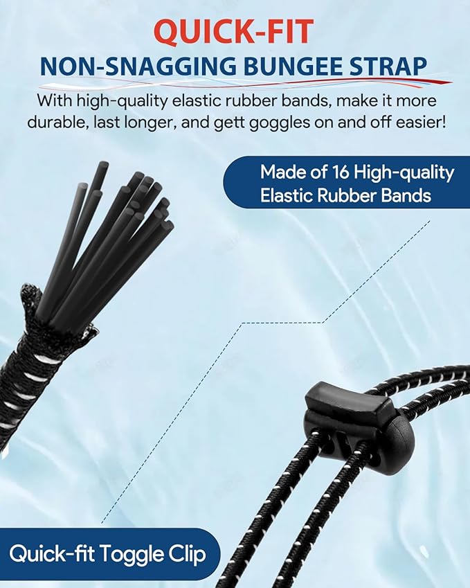 - Easy Adjust & No Hair-pulling: Otionus swim goggles feature a user-friendly strap design that allows easy adjustment of tightness with a simple press, saving you time and eliminating worries about tangled hair. Moreover, unlike conventional silicone straps, our bungee strap is made up of 16 ultra-soft rubber bands, providing a comfortable and non-adhesive feel.