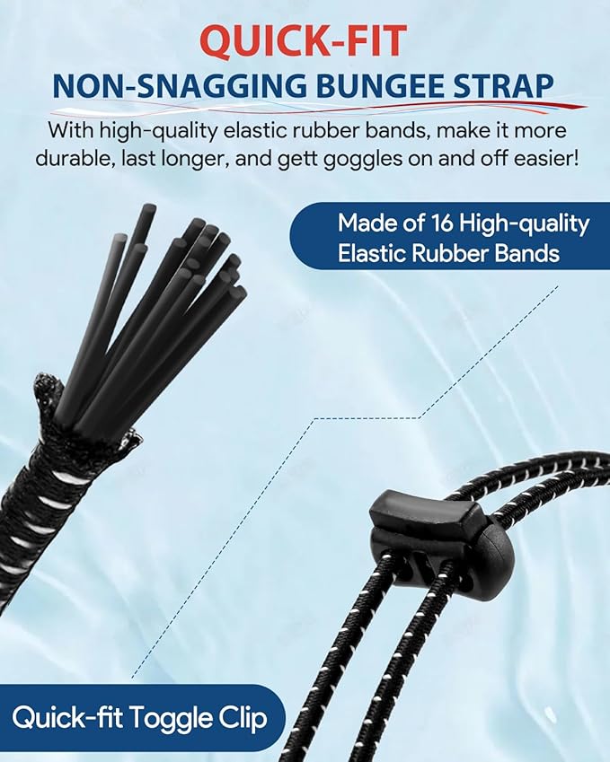 - Easy Adjust & No Hair-pulling: Otionus swim goggles feature a user-friendly strap design that allows easy tightness with a simple press, saving you time and eliminating worries about tangled hair. Moreover, unlike conventional silicone straps, our bungee strap is made up of 16 ultra-soft rubber bands, providing a comfortable and non-adhesive feel.