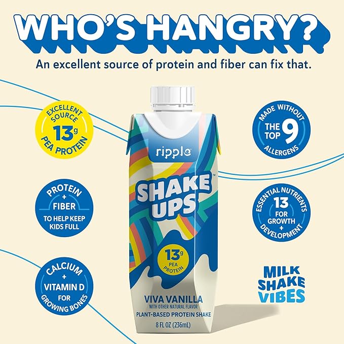 Ripple Kids Vanilla Plant Based Shake Ups | 13g of Quality Sourced Pea Protein, Calcium Rich | Shelf Stable | Vegan & Non GMO | Dairy, Soy, Nut, Gluten & Lactose Free | 8 Fl Oz Cartons (Pack of 12)