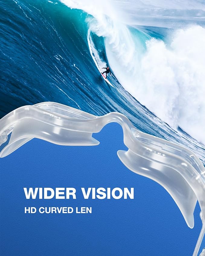 - Clear Panoramic View: Equipped with curved, high-definition lenses, the anti-fog goggles offer a wider peripheral vision. The 180° viewing angle ensures that you maintain visibility in crowded pools or open waters, keeping you safe at all times.
