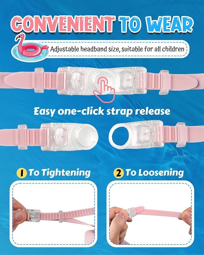 - 【PANORAMIC VIEW & EASY TO WEAR】 Our kids' goggles provide a mask-like fit, carefully designed to accommodate children's faces and ensure a comfortable and secure seal. This not only offers a beautiful and stylish appearance but also expands your child's underwater vision with a panoramic viewWith a convenient button-release design, these goggles are incredibly easy for kids to put on and take off by themselves, promoting independence and a hassle-free swimming experience.