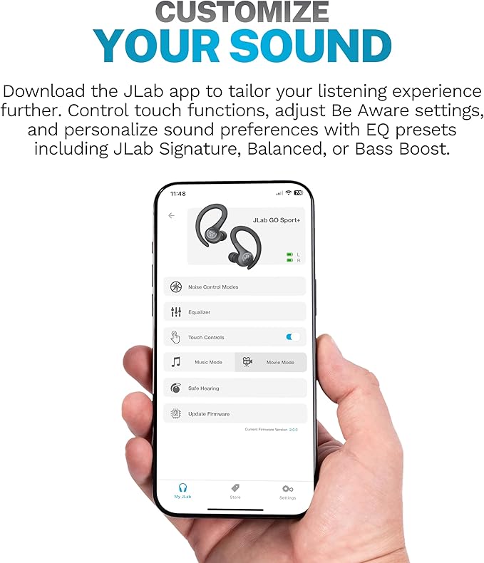 - Custom Sound via JLab App: Easily customize your sound experience using the JLab App. Control touch functions, adjust Be Aware settings, and personalize sound preferences with EQ presets including JLab Signature, Balanced, or Bass Boost