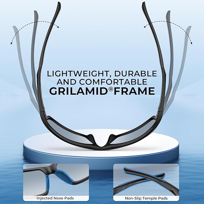 - KEY FEATURES – Impact-resistant polarized 1.0mm TAC lenses reduce glare, Block 100% of harmful UVA and UVB rays, Oleophobic and saltwater resistant lens coatings protect mirror finish, Full wrap frame design, Lightweight, durable, and comfortable Grilamid frames, Non-slip temple pads.