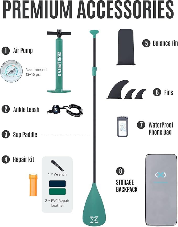 - 【All-in-one Versatility Adventure】Paddle board accessories kit includes paddles, waterproof phone pouch, safety leash, and repair patches, just grab and explore! With 14 stainless steel D-rings and 2 quick-release handles, ZLX inflatable SUP can be mounted with a paddle board seat for fishing, coolers, or rods securely. The front camera mount can record every happy moment for your paddling!