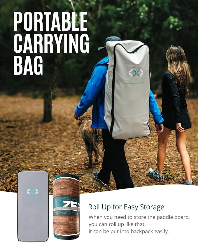 - 【Ultimate Portability】ZLX inflatable paddle board for adults rolls into a lightweight backpack(included) for hands-free hiking to remote lakes and coastal beaches – 30% more compact than wooden boards. Fits effortlessly in car trunks or apartment closets, with rapid inflation(air pump included), ready for lake adventures and beach days in under 8 minutes.