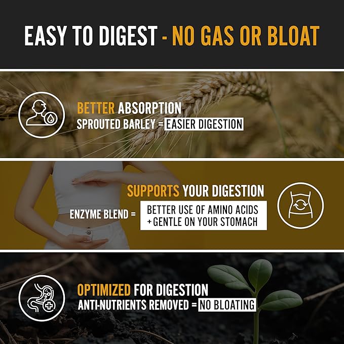 - GENTLE ON YOUR GUT – No more protein bloat and discomfort – Our Barley is harvested at the perfect time (just as it’s “sprouting”) making it easy on your stomach; Our Pea protein passes through a process to make it smooth and remove the beany flavor notes; Then, RISE311 chocolate plant protein powder has a special “enzyme blend” that helps your body break down protein into the amino acids it needs and uses to support your health