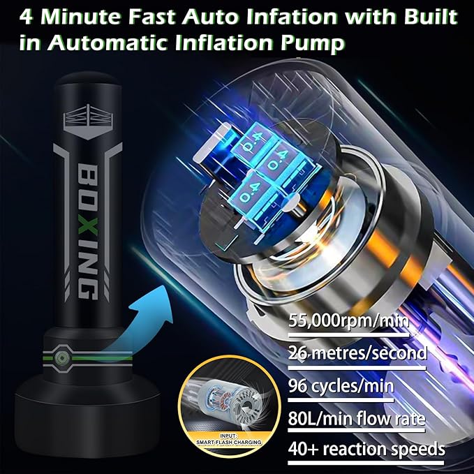 - Upgrade Automatic Inflation Pump: The heavy punching bag made with built-in rechargeable automatic air pump, upgraded one press inflating technology helps you inflate the stand up punching bag more conveniently, completely freeing your hands, allowing you to use the punching bag for adults with stand anytime and anywhere.