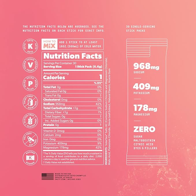 Keto Chow SALTT Electrolytes Powder Packets, Fruit Variety Pack (30 Packets) - Magnesium, Potassium, Sodium, Trace Minerals - Vegan, Sugar Free, Gluten Free - Travel Essentials - Made in USA